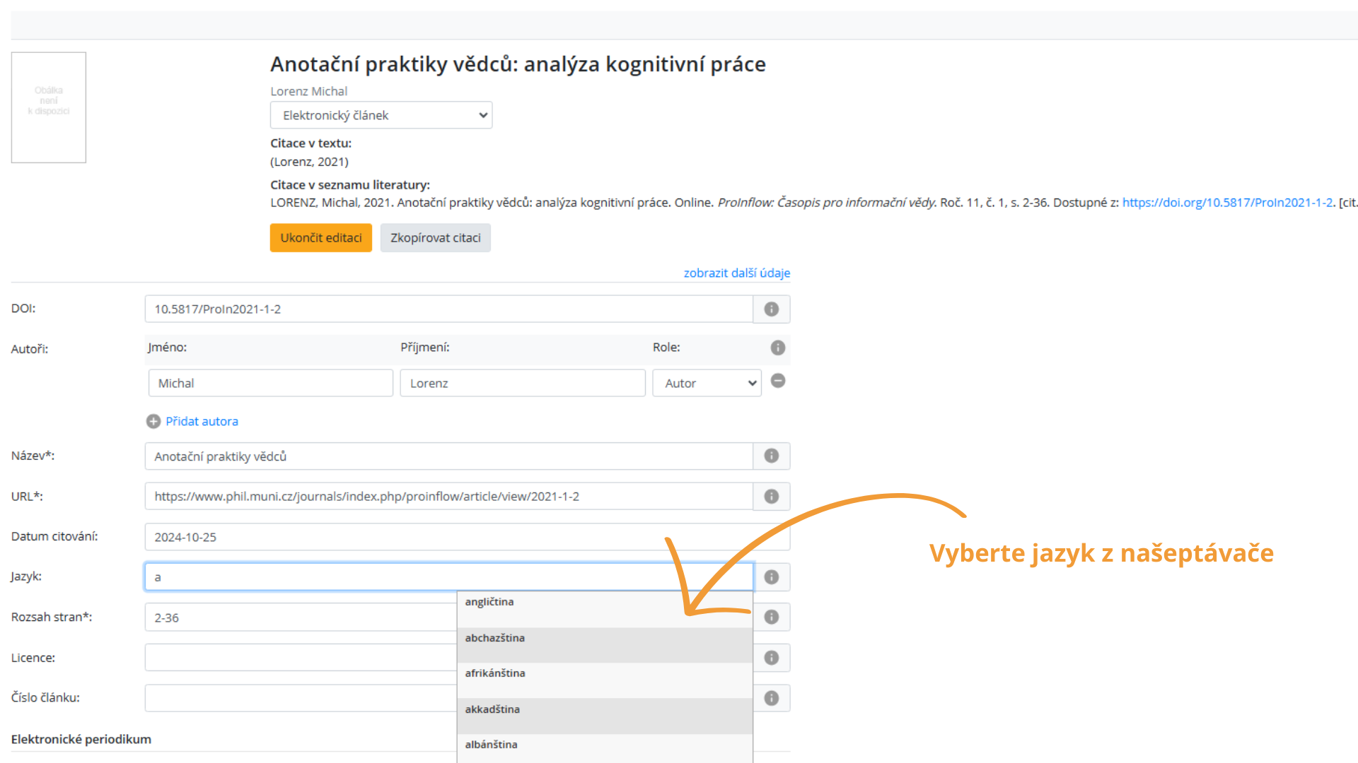 V údajích o článku vyplňte pole Jazyk. Při vyplňování tohoto pole využijte nabídku našeptávače. Např. angličtina, němčina apod.
