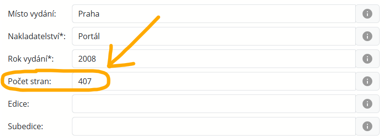 Počet stran v citaci je dle ČSN ISO 690 i jiných stylů nepovinný údaj, proto je zařazen mezi nepovinné údaje. Pokud tento nebo jiný nepovinný údaj chcete přece jenom uvést, klikněte při editaci citace na "zobrazit další údaje" a příslušný údaje vepište.