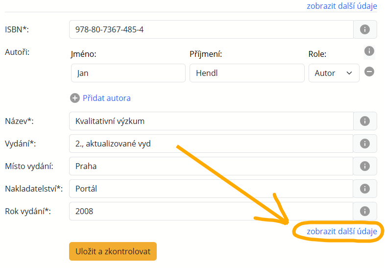 Manažer je nastaven tak, aby uživatele upozornil na nevyplněné povinné údaje, které ve formuláři označí červeným křížkem. Toto upozornění má pro uživatele pouze informativní charakter a citaci lze uložit, i když nejsou vyplněny všechny povinné údaje.